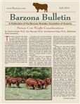 REGISTERED, PUREBRED BARZONA Breeder since 1986 Certainly, larger mature cow size generates more cull cow income, and this is considered in previously mentioned economic evaluations. One factor often overlooked when crediting larger cows with increased cull income is that additional cow weight is not free to begin with. For example, when comparing 1,000-pound cows to 1,400-pound cows and a $70 per hundredweight cull cow price, the 1,400-pound cows generate an additional $280 at culling time. However, the additional 400 pounds of growth requires additional nutrients through the development stages and through about 6-7 years of age, when they finally reach their mature weight. While portion of this variation. Perhaps this is a good time to point out that in almost any cow herd there will be small cows that are individually efficient (relatively high weaning weight for their mature size) and there will be large cows that are individually efficient. Nevertheless, although the relationship was not strong, it was statistically significant and positive. We found that for each 100 pounds of additional cow weight, calf weaning weight increased by an average of 6.7 pounds. Arkansas data published in 2006 indicated that this relationship was 15 pounds of added weaning weight for each 100 pounds of additional cow weight. Climate may be important in this relationship. We suspect, without solid evidence, that in challenging environments larger cows will wean calves weighing about 6 pounds more per each 100 pounds of additional cow. In less restrictive environments, larger cows would be expected to wean calves weighing 15 or more pounds per each 100 pounds of additional cow weight. “Less restrictive” can be interpreted as higher-quality, more abundant forage, lower stocking rate (allowing the cattle to select a better quality diet), more harvested forage feeding, more supplementation, more winter annual grazing, less heat or cold stress, less parasite exposure and so on. Based on the evidence we have available, it appears that each additional 100 pounds of cow weight generates about $6 to $20 of added calf income, depending on the calf market.We estimate that the addition of 100 pounds of cowweight costs around $40 to $50 per year to maintain. To take this a step farther, in several published economic evaluations of varying cow size and a given land resource, smaller and moderate cows have a financial advantage for three primary reasons: 1) higher stocking rates for smaller cows result in more pounds weaned per acre; 2) lighter calves sell for a higher price per hundredweight; and 3) the increased revenues from added weaning weights do not offset the higher feed costs of larger cows. Obviously, items 2 and 3 in this list assume little to no market discount for smaller- framed calves that may have lower growth rate and are likely to have lighter carcass weights.